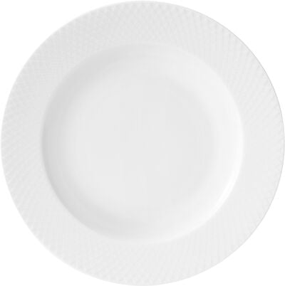 Riflet rillet med sirligt mønster eller blot med en diskret dekorativ effekt. Lyngby tallerkner 27 cm hvid.